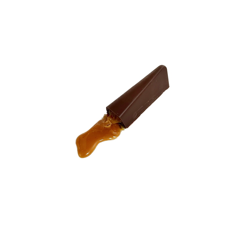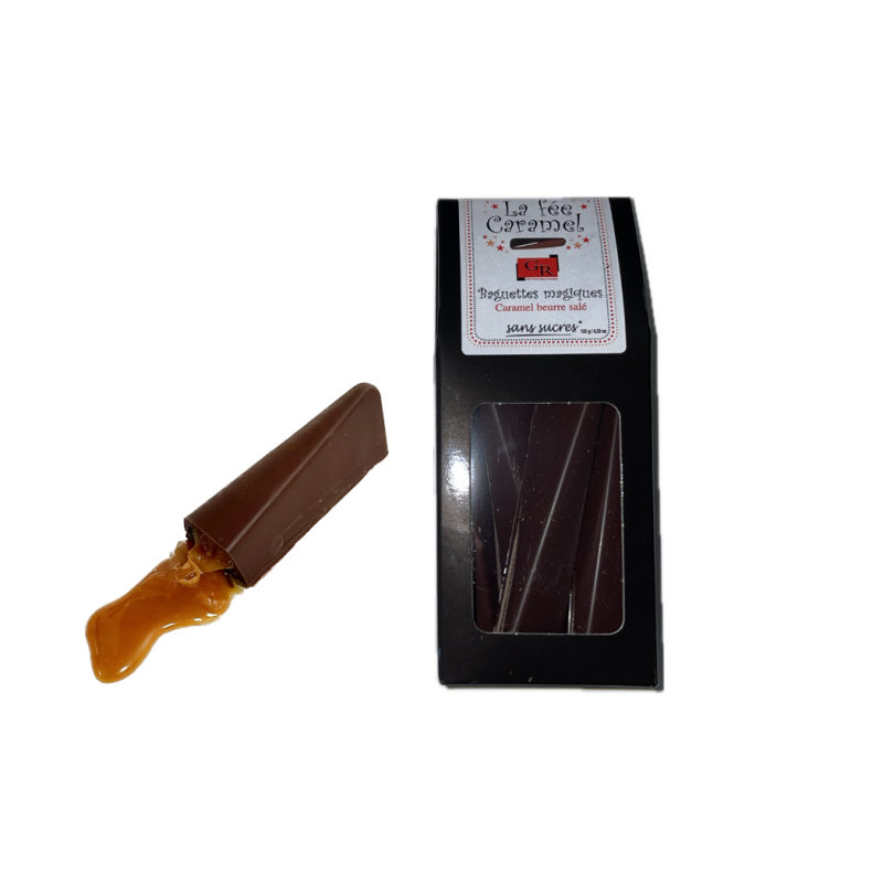 Bâtons de chocolat noir à 72% de cacao fourrés de caramel beurre salé onctueux. Sans saccharose avec un index glycémique bas, bien entendu.