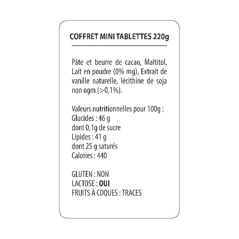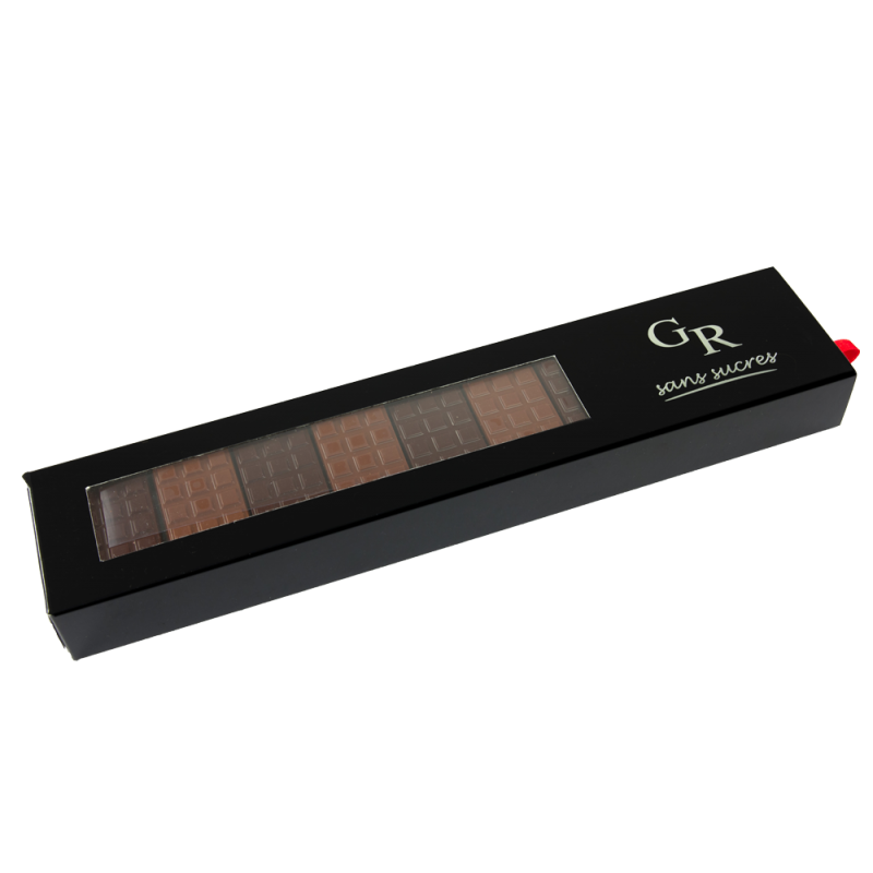 Ces 45 mini-tablettes offrent une large palette de saveurs, à déguster avec un café ou pour une pause gourmande ! Les mini-tablettes proposées sont au chocolat noir 64 %, 72 % et 90 % de cacao, tandis que celui au lait est à 43 % de cacao. Sans saccharose avec un index glycémique bas