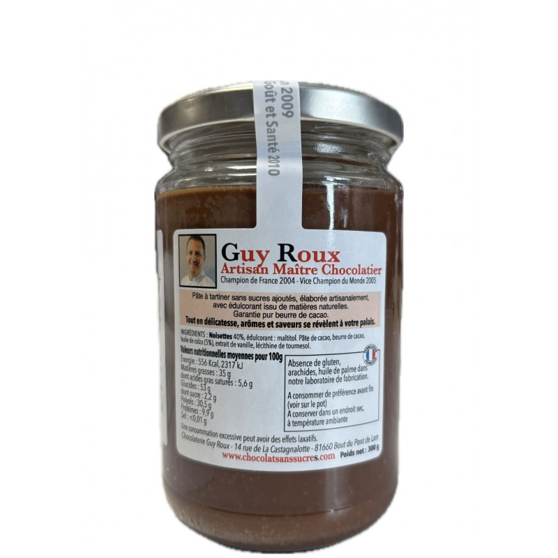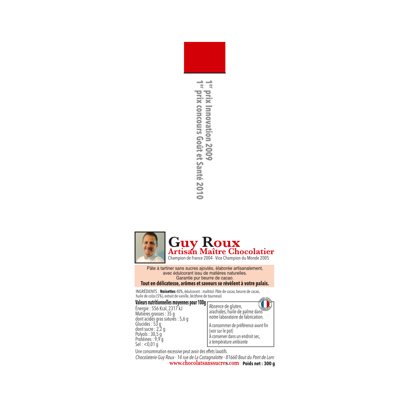 Composition : Noisettes (40 %), édulcorant : maltitol. Pâte et beurre de cacao, huile de colza (5%), extrait de vanille, lécithine de tournesol non OGM (0,2 %). SANS LACTOSE