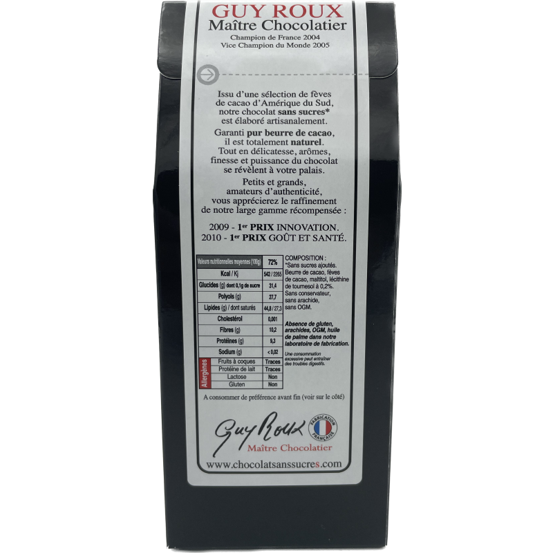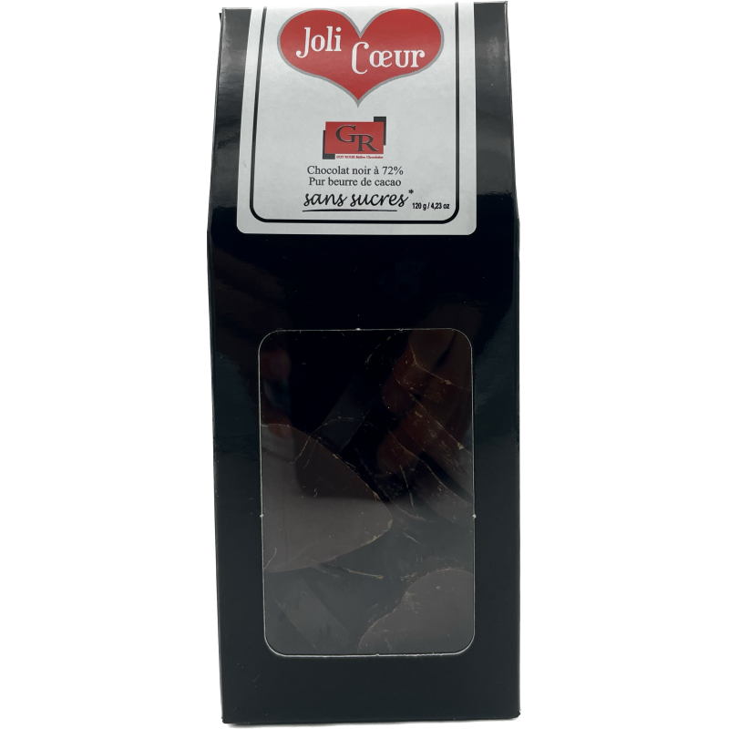 Ces bonbons fins au chocolat noir sans saccharose avec un index glycémique bas, feront craquer ceux que vous aimez. Cœur à croquer, cœur fondant, cœur à prendre…. Toujours pur beurre de cacao, pour un vrai goût de chocolat. Chocolat noir grand cru à 72% de cacao.